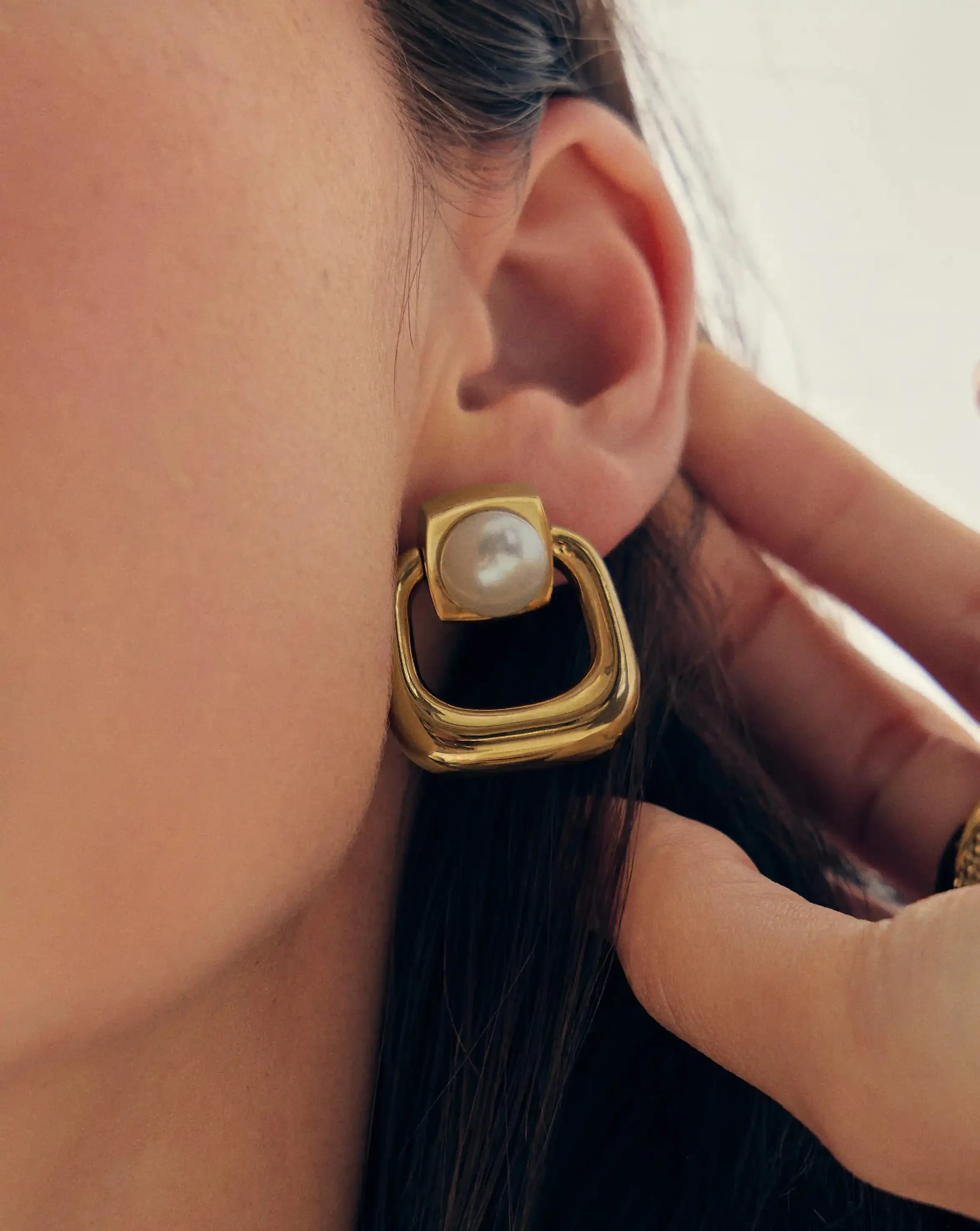 These door knocker-style earrings are your perfect go-to for a statement look featuring a square pearl stud. Let them take centre stage or style with studs for an instant ear stack.
