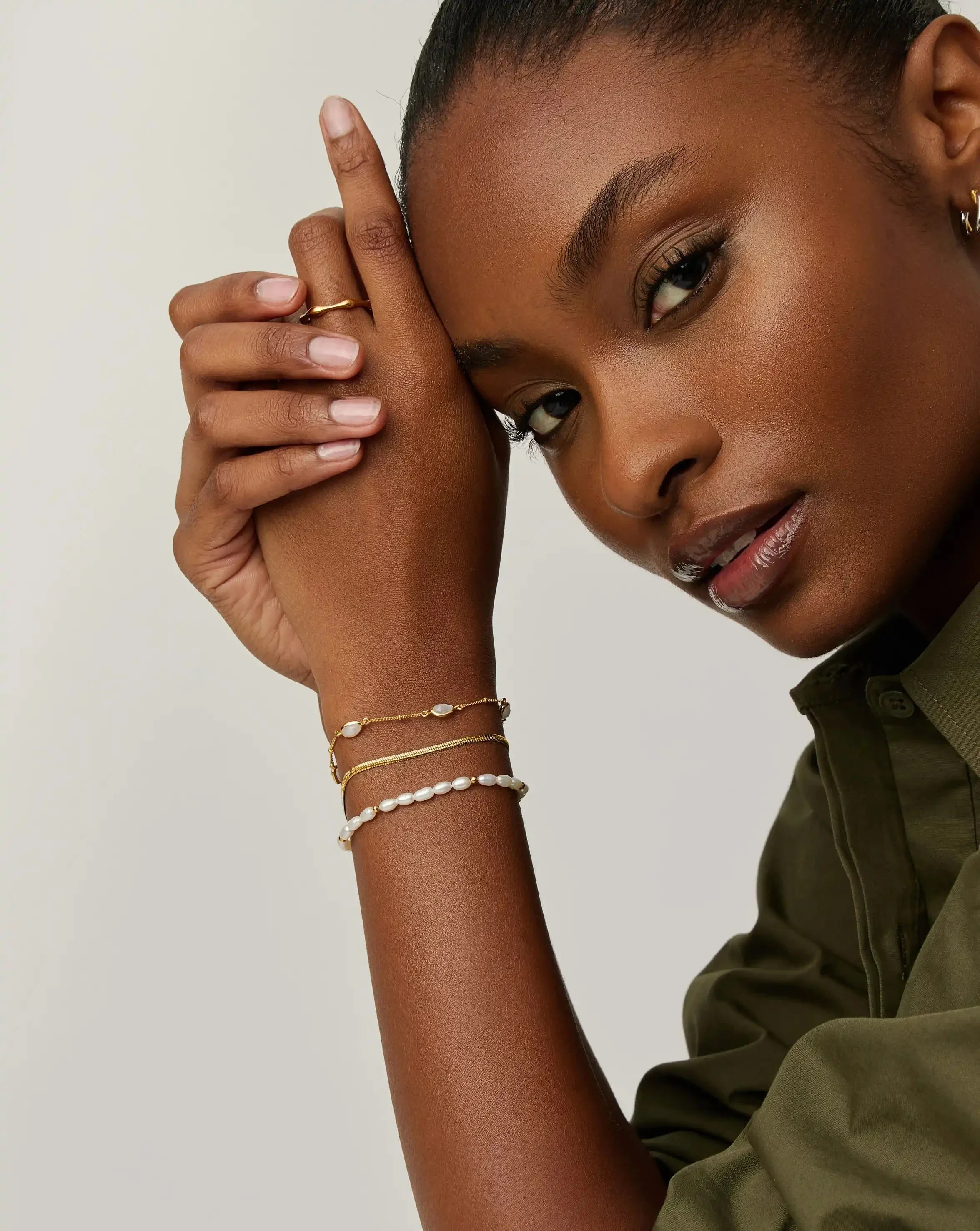 A trio of icons. The Seed Pearl Beaded Bracelet and Magma Gemstone Charm Bracelet meet our Thin Snake Chain Bracelet for a signature stacked look.