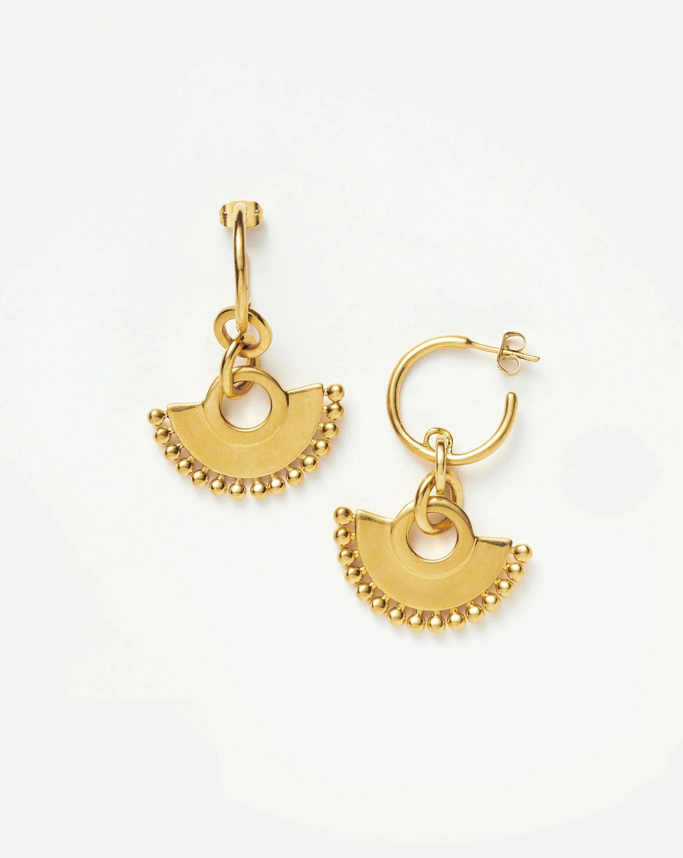 Everyday statement hoops inspired by Colombia. These unique best selling earrings feature bobble-trimmed charms suspended from delicate hoops in 18ct gold plating. Add to your ear stack with chunky gold huggies or pair with the Zenyu Fan Necklace. As seen in The White Lotus.
